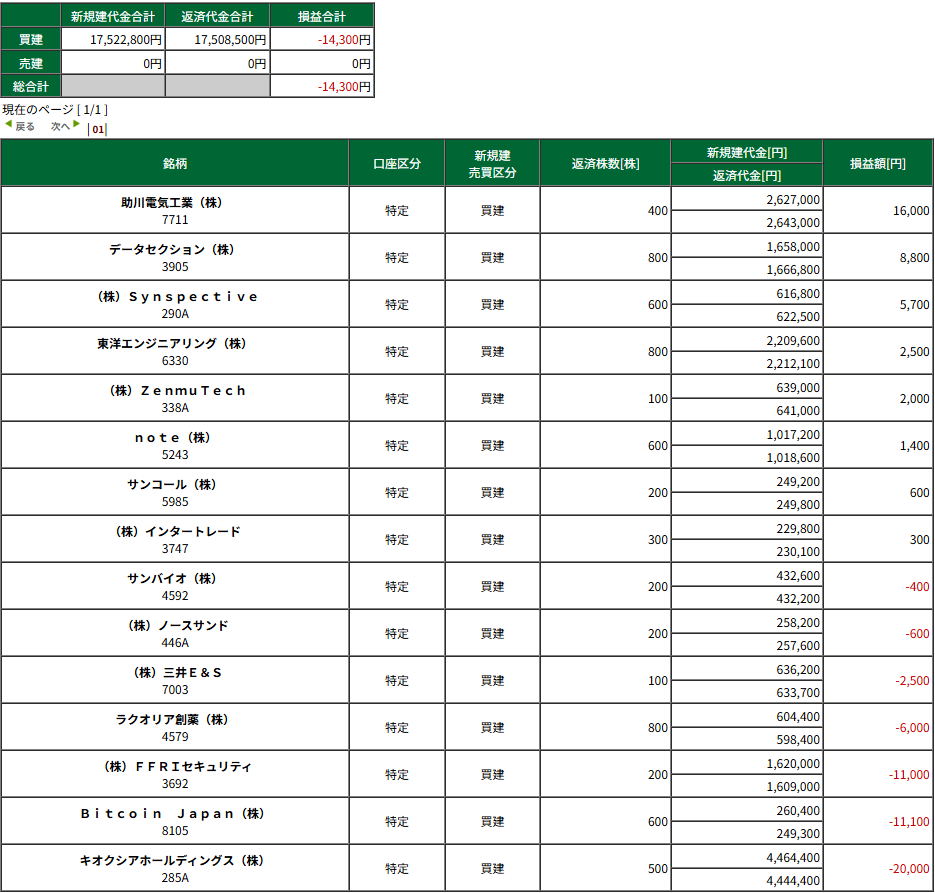 HOME > 日々の記録 > 日々の記録 下手男 -11/26(水) デイトレ結果- 投稿日:2025年11月26日 15:35 地合いは明らかによかったがなんか負け。 シンプルに下手である。 本日の収支:-14,300円 今月の収支:+205,476円(税引後) 広告 広告 ブログランキング参加中です。 応援よろしくお願いします。 -日々の記録
