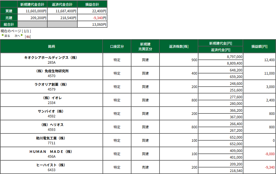 HOME > 日々の記録 > 日々の記録 下手男 -12/11(木) デイトレ結果- 投稿日:2025年12月11日 15:58 フィジカルAI関連とかいうノリでキチ上げしてた銘柄群の朝の気配が死亡遊戯だったので、ヒーハイストを寄りから空売りするも、こいつだけ異常に強くてカット 冷静に考えると空売りするなら一番群れを率いて上げてた銘柄ではなく、それについていってた銘柄の方がよかった。 普通に選定が下手。 ちなみに後場は割と普通に下げてた。 本日の収支:+13,060円 今月の収支:+156,405円(税引後) 広告 広告 ブログランキング参加中です。 応援よろしくお願いします。 -日々の記録