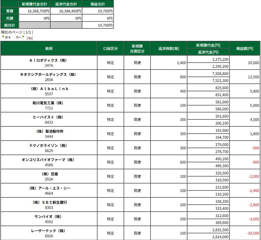 HOME > 日々の記録 > 日々の記録 朝一ハズレ男 -12/18(木) デイトレ結果- 投稿日:2025年12月18日 15:39 寄り付き、半導体関連軒並み特売りから寄り付き陽線叩きだしているのを見て、まだ特売り状態だったレーザーテック、こいつに凸。 普段やらんけどこれはいくしかない、今日はコイツに決めた。 唯一のハズレ引いて朝から悶絶。 これをキオクとAIロボでコツコツ戻して終了。 本日の収支:+19,700円 今月の収支:+159,673円(税引後) 広告 広告 ブログランキング参加中です。 応援よろしくお願いします。 -日々の記録
