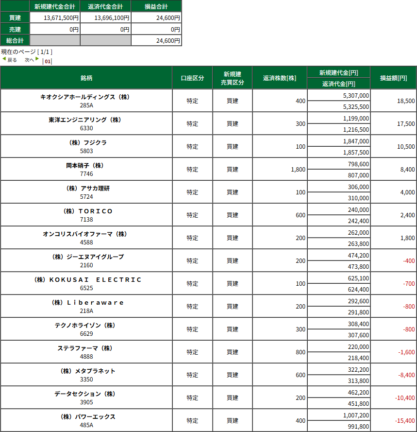 HOME > 日々の記録 > 日々の記録 グロース復活の兆候 -1/7(水) デイトレ結果- 投稿日:2026年1月7日 16:33 結果的に全然取れちゃいないんだが、グロースの日足が10億年ぼりに上向いてきているので嬉しい。 馴染みのクソ銘柄たちもよく動いてたり謎のストップ高だったりと、感謝。 明日以降も是非よろしくお願いします。 本日の収支:+24,600円 今月の収支:+36,814円(税引後) 広告 広告 ブログランキング参加中です。 応援よろしくお願いします。 -日々の記録