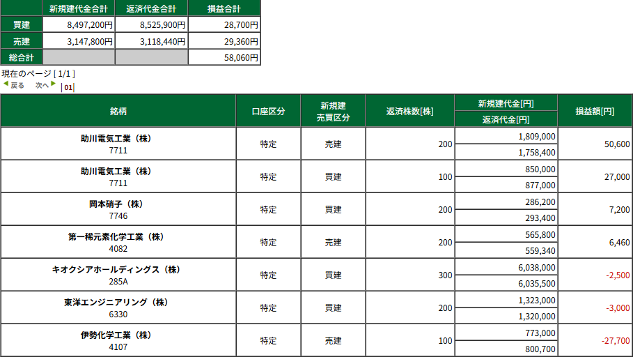 HOME > 日々の記録 > 日々の記録 選挙明け相場 -2/9(月) デイトレ結果- 投稿日:2026年2月9日 15:32 朝から先物ワッショイ状態でデイトレ的にはあんまりの一日。 寄ってからしばらくはほとんど様子見てたけど、直近テーマ系が崩れてるの見て売りをちょこっと入れるも銘柄選定悪しであんまり取れず。伊勢めっちゃ担がれたわクソ 唯一助川だけ往復で取れてほとんどこの利益。 さすがにもうちょい取れた感あり。 本日の収支:+58,060円 今月の収支:+204,201円(税引後) 広告 広告 ブログランキング参加中です。 応援よろしくお願いします。 -日々の記録