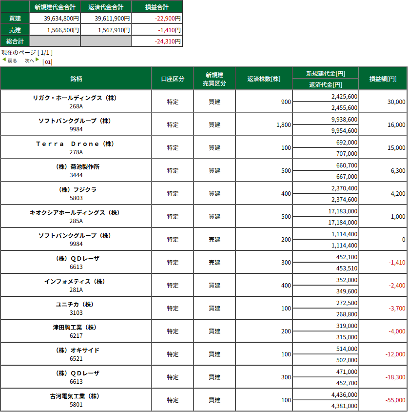 HOME > 日々の記録 > 日々の記録 寄り付き養分 -4/22(水) デイトレ結果- 投稿日:2026年4月22日 15:40 古河、オキサイド、QD等、寄り凸銘柄の選定がゴミで、寄りからド派手に-80kくらいの負債を負って早々に敗戦処理の一日。 津田駒、ユニチカをぶん回すのは今の弱ったメンタルの俺には無理だった模様。 …あの、結局キオク買って寝てれば幸せになる相場なんすか?? 本日の収支:-24,310円 今月の収支:-536,987円(税引後) 広告 広告 ブログランキング参加中です。 応援よろしくお願いします。 -日々の記録
