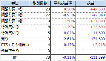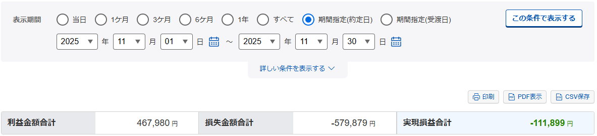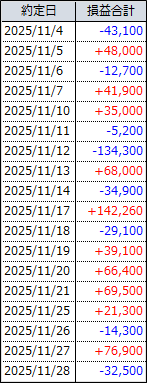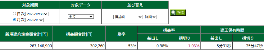 HOME > 日々の記録 > 日々の記録 2025年11月の振り返り 投稿日:2026年1月2日 01:06 続けて2025年11月の振り返りです。 松井収支(裁量デイトレ) 10勝8敗で合計が+302,260円でした。 収支ボラでかめ。多分キオクシア。 楽天収支(ほぼシストレ) -111,899円 クソ株の空売りでめちゃ担がれてた。 2025年はこのパティーン多かったなぁ。 合計収支 +151,689円(税引き後) そらブログ更新する気も起きんわな。 まとめ とにかく後半苦しんでる。 広告 広告 ブログランキング参加中です。 応援よろしくお願いします。 -日々の記録