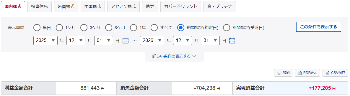 HOME > 月別振り返り > 月別振り返り 2025年12月の振り返り 投稿日:2026年1月2日 04:27 2025年12月の振り返りです。 松井収支(裁量デイトレ) 17勝3敗で合計が+386,900円でした。 ボラ少なめ。 楽天収支(ほぼシストレ) +177,205円 また空売りクソ株担がれ祭り。 合計収支 +449,507円(税引き後) インフレの波についていけていない収支。 まとめ 2025年単月まとめ、これにて終わり。 2026年からは、記憶のあるうちに月まとめ書きたい所存です。 広告 広告 ブログランキング参加中です。 応援よろしくお願いします。 -月別振り返り