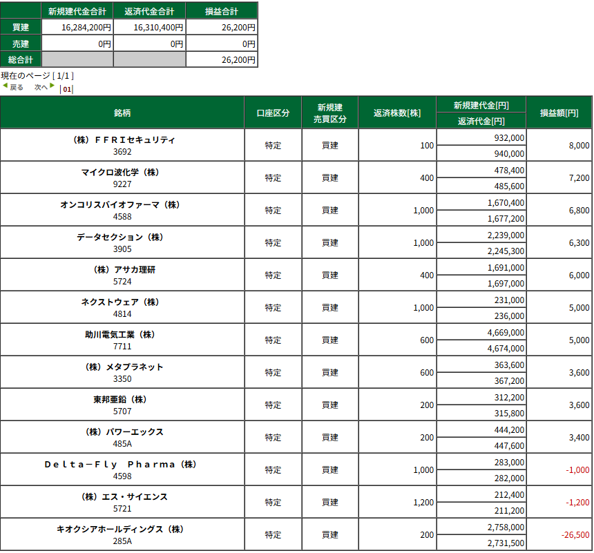 HOME > 日々の記録 > 日々の記録 乗れず -1/14(火) デイトレ結果- 投稿日:2026年1月14日 16:42 個別はまだまだバブル継続といった感じだが、波には乗れず。 本日の収支:+26,200円 今月の収支:+62,234円(税引後) 広告 広告 ブログランキング参加中です。 応援よろしくお願いします。 -日々の記録