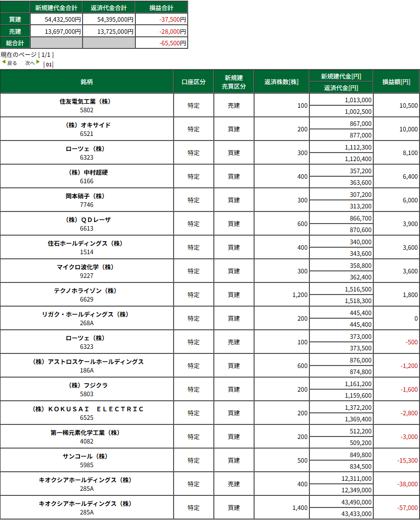 HOME > 日々の記録 > 日々の記録 キオク往復チンパン再び -4/20(月) デイトレ結果- 投稿日:2026年4月20日 15:30 キオク朝の凶悪な上げ下げであっさりと往復ビンタ高速-100k 10分で1300円下げて5分で700円戻してたけど一体どういうことだい? その後はどうにか我慢できたので金額的にはまあまあ負けたけど実質勝ちということでよろしいか。 本日の収支:-65,500円 今月の収支:-582,718円(税引後) 広告 広告 ブログランキング参加中です。 応援よろしくお願いします。 -日々の記録